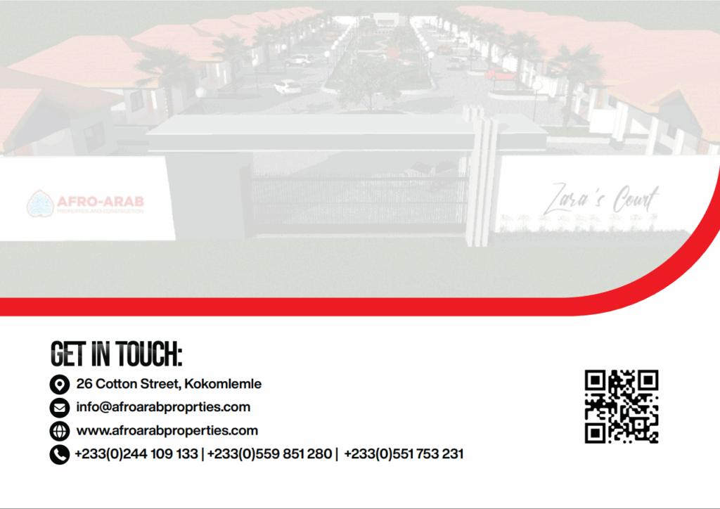 Afro Arab Properties proudly presents Zara’s Court, an exclusive collection of modern townhouses located in Santoe, Accra. The Project features 10 two-bedroom houses and 9 three-bedroom houses, each with a semienclosed compound and private parking space for 2 to 3 cars. Zara’s Court offers residents shared amenities, including a gym, swiming pool, children’s play ground, and a central garden designed .